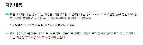 - 여름(7~9월)에는 전기 요금 차감을, 겨울(10월~익년4월)에는 전기·도시가스·지역난방·등유·연탄·LPG 중 한 가지를 선택하여 구입할 수 있 전자바우처(이용권)를 지급합니다.