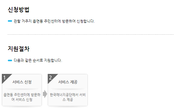 먼저 관할 읍면동 주민센터에 방문하여 에너지바우처를 신청 가능합니다. 순서로는 먼저 에너지바우처 서비스 신청을 하고, 해당 서비스 제공 조건이 맞을 경우 한국 에너지 공단에서 서비스를 제공하게 됩니다.