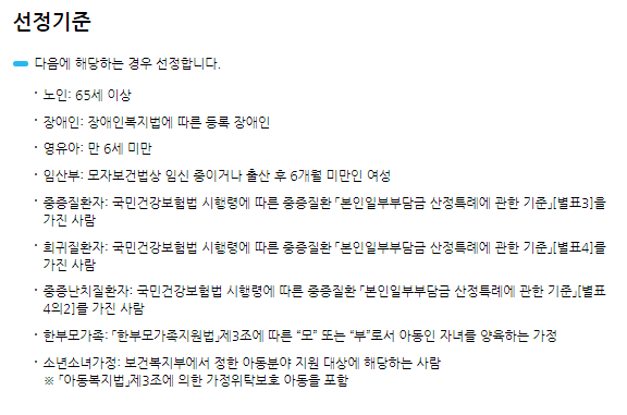 - 중증난치질환자: 국민건강보험법 시행령에 따른 중증질환 「본인일부부담금 산정특례에 관한 기준」[별표4의2]를 가진 사람
